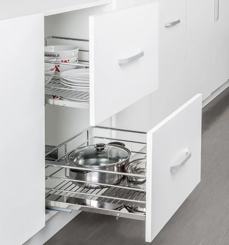 Nếu thiết kế tủ bếp sử dụng dạng cửa mở thì bạn nên lựa chọn kệ xoong nồi dạng ray trượt dành cho cửa có bản lề để giữ được sự đồng bộ.