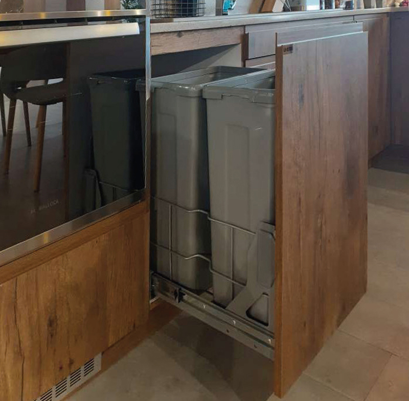 Thùng rác thông minh chứa đựng rác thải sinh hoạt, rác thải trong quá trình nấu nướng; giúp thao tác khi sơ chế thực phẩm của người nội trợ diễn ra nhanh chóng, sạch sẽ, tránh làm bẩn các khu vực xung quanh.