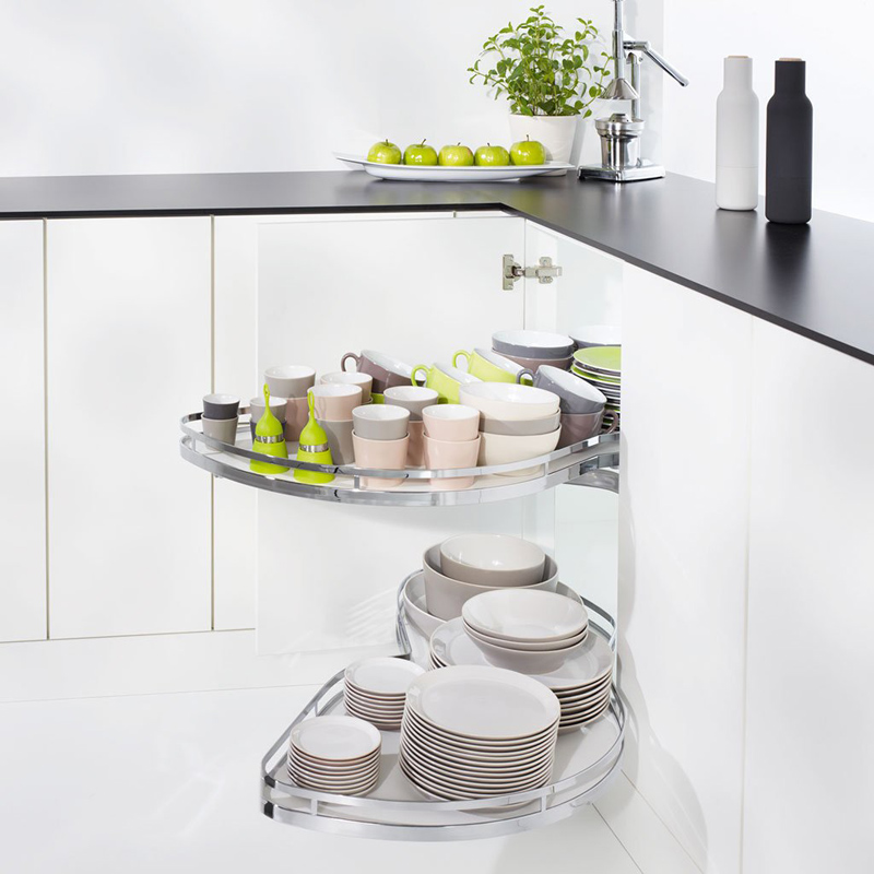 Nếu gia đình bạn sử dụng cửa tủ kiểu cánh mở thì bạn có thể chọn bố trí Kệ góc mở toàn phần hoặc Kệ góc xoay để đồng bộ với thiết kế của căn bếp.