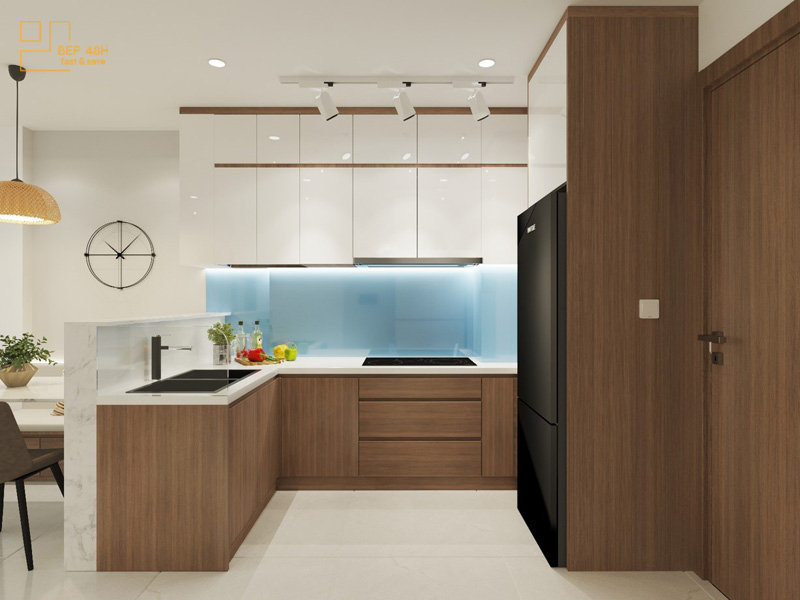 Tủ bếp chữ U gỗ công nghiệp MDF phong cách hiện đại. Hệ tủ sử dụng cánh tủ phẳng, tay nắm vát 45 độ. Tủ bếp trên phủ lớp Laminate trắng với thiết kế kịch trần giúp tránh được tình trạng bám bụi bẩn trên đầu tủ, đồng thời tận dụng diện tích tối đa. Mặt bếp được ốp đá sứ trắng hài hòa với không gian, tường bếp được ốp kính cường lực ốp bếp 8 ly màu xanh vừa tạo điểm nhấn nhưng không quá sặc sỡ.