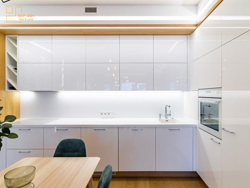 Mẫu thiết kế phá cách với dáng tủ bếp chữ L có một cạnh được biến tấu giống như một bề mặt tường lớn. Số lượng khoang chứa nhiều mang đến khả năng lưu trữ ấn tượng. Lớp phủ Acrylic trắng bóng gương kết hợp với cách bố trí ánh sáng làm cho bộ tủ bếp trở nên “bừng sáng” và toát lên sự hiện đại. Các thiết bị thông minh được đặt âm tủ tạo cảm giác gọn gàng. Mặt đá trắng sứ ốp bếp nhẵn mịn, có tính thẩm mĩ cao.
