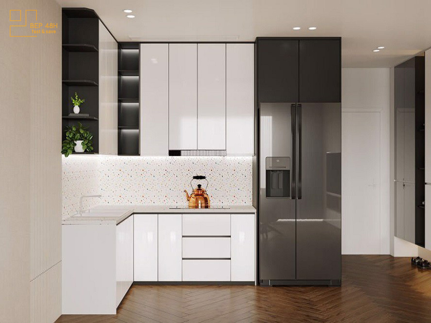 Mẫu thiết kế với hai cạnh tủ ôm sát góc tường giúp tận dụng không gian một cách triệt để. Cả hai hệ tủ bếp trên và dưới đều được làm từ chất liệu nhựa phủ Acrylic bóng gương không chỉ có độ bền cao mà còn sở hữu một diện mạo vô cùng hiện đại. Phần bo cạnh tủ với gam màu đen được thiết kế dạng mở không cánh tạo thành điểm nhấn độc đáo trong mẫu thiết kế này. Đá ốp tường Vicostone dòng Crystal Ice với họa tiết nhuyễn, mịn, vô cùng bắt mắt.